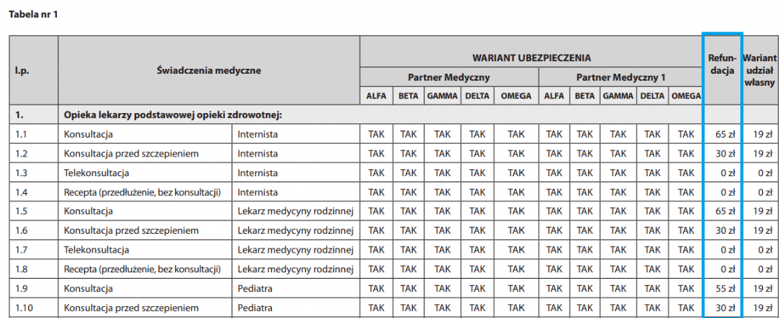 Na poniższym przykładzie zaznaczone zostały pola tabeli w OWU na których widnieją kwoty refundacji wybranych konsultacji lekarskich.